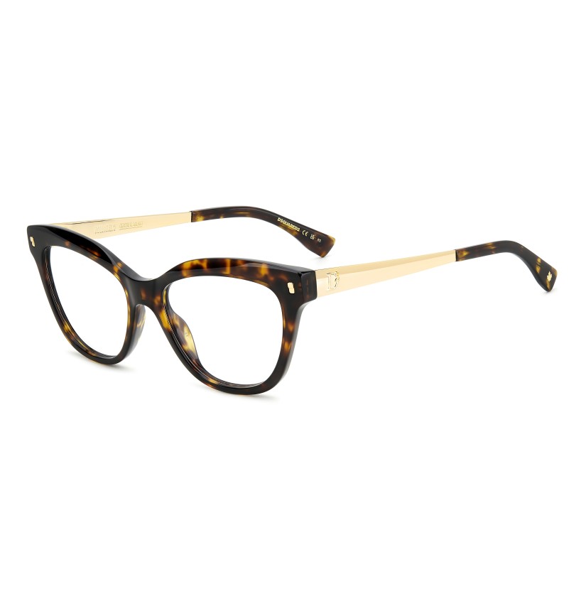 These DSQUARED2 eyeglasses were designed to complete every look with a touch of bold femininity. The prominent, multi-faceted cat-eye front frames the face in acetate, decorated by distinct rivets. Made of metal, the temples are trimmed by the D2 logo, and the CERESIO 9, MILANO inscription on the inside. The fit is especially comfortable thanks to the acetate end tips, which are decorated by the brand's symbol: the maple leaf.