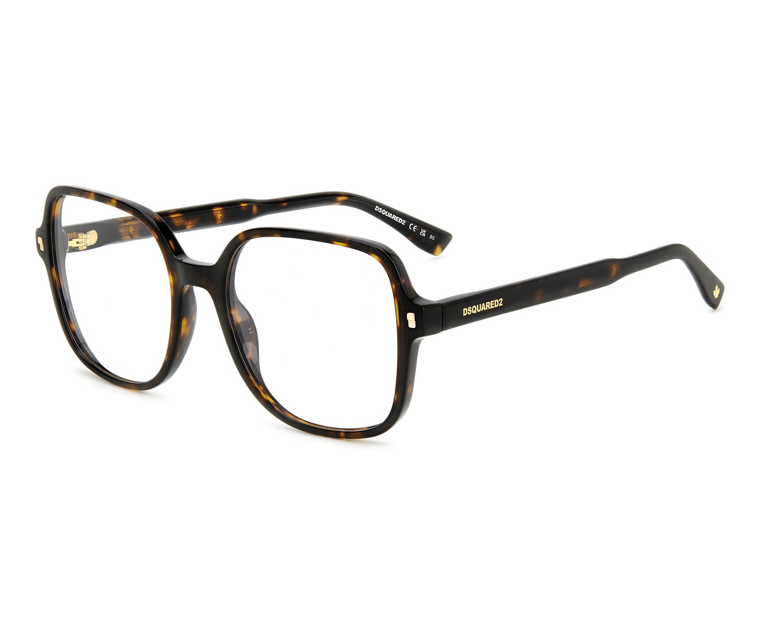 These semi-bold eyeglasses have been given a fresh twist thanks to the lighter proportions of the new acetate front. The metal core with the engraved DSQUARED2 'tape' can be seen through the original temples. The brand has also signed these women’s glasses with an injected logo on the outer temple near the hinges, and with the must-have maple leaf on the comfortable end tips: distinctive features that convey truly unique design.
