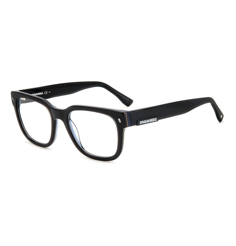 These masculine DSQUARED2 eyeglasses in acetate are unmistakable thanks to square frames accented by metal rivets in the upper corners, and bold temples that taper towards the end tips, trimmed by the brand's maple leaf. Another detail that distinguishes these men's glasses is the raised plaque on the temples, inspired by the tag found on DSQUARED2 jeans.