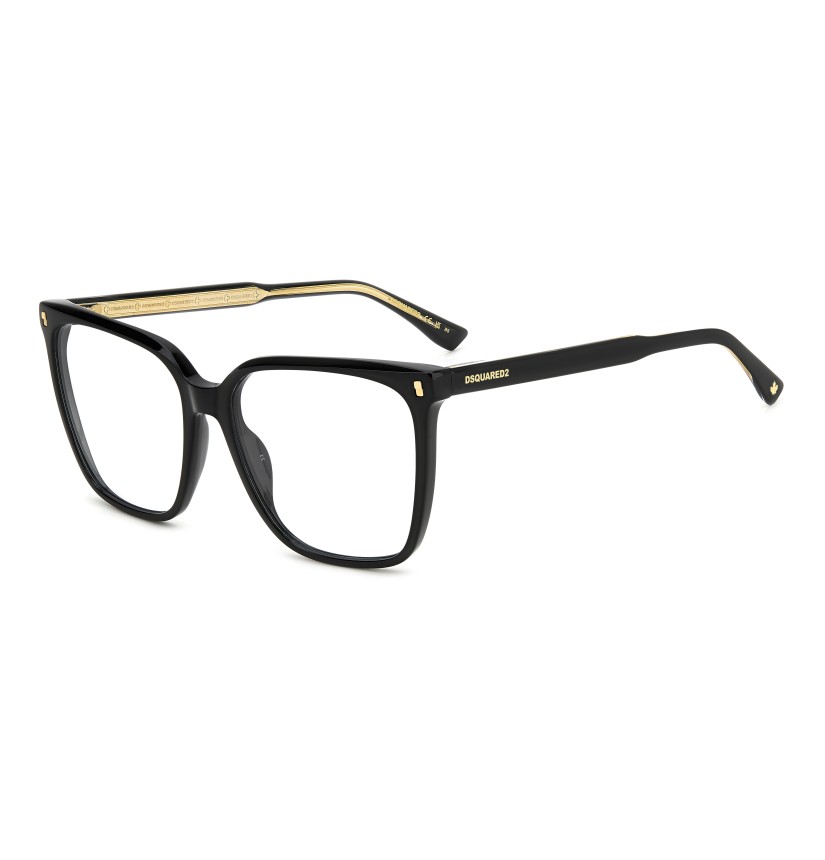 These eyeglasses for women by DSQUARED2 are a true gem to flaunt day after day. This light acetate frame has bevelled edges for a multifaceted look, offered in feminine shapes. Set against a classic colour palette, the brand's inserts stand out: rivets on the front, a DSQUARED2 logo, the CERESIO 9, MILANO inscription on the inside of the right temple, and the maple leaf on the end tips.