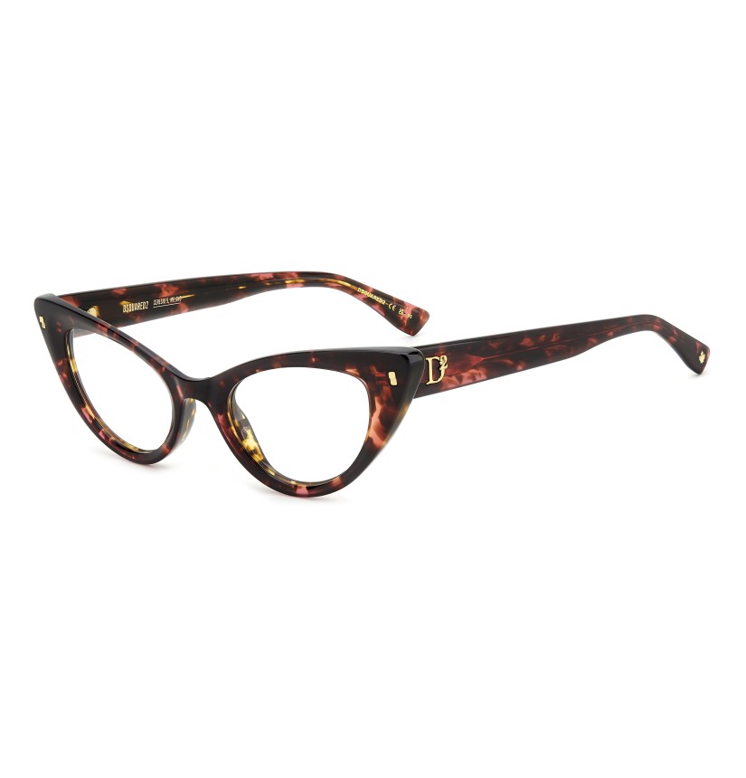 These eyeglasses for women by DSQUARED2 are a true gem to flaunt day after day. The acetate frames have bevelled edges for a multifaceted look, offered in feminine shapes. Set against a classic colour palette, the brand's inserts stand out: rivets on the front, a D2 logo, the CERESIO 9, MILANO inscription on the inside of the right temple, and the maple leaf on the end tips.