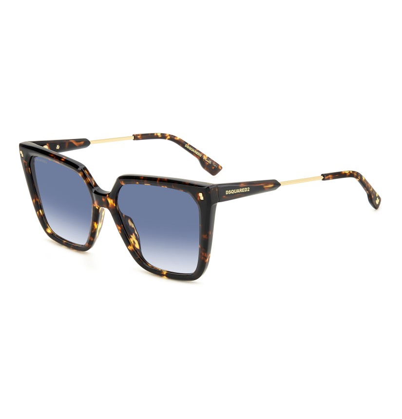 DSQUARED2 continues to mix aesthetics and moods in these sunglasses for women. The square frames are a classic in the eyewear world, here given a modern update with a bold acetate profile and the brand's iconic rivets. The creativity of the temples, which combine metal and polyamide, is astonishing, trimmed by the DSQUARED2 logo and the maple leaf on the end tips. This style comes with gradient or mirrored lenses, which can also be swapped out for prescription lenses of the customer's choosing.