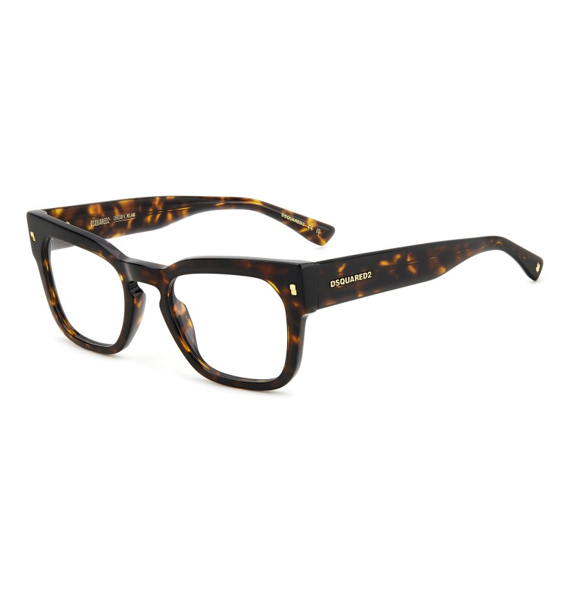 These unisex eyeglasses are the perfect embodiment of the aesthetic vision of DSQUARED2. They bring a decisive touch to everyday outfits via their acetate structure, which has been sculpted into robust proportions. The cateye frames with a keyhole bridge are striking, decorated by the iconic DSQUARED2 rivets. Even the temples are noteworthy, trimmed by a raised logo on the outside and the CERESIO 9, MILANO inscription on the inside.