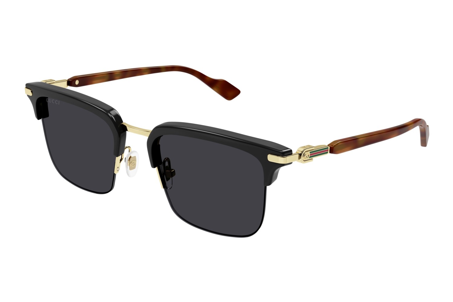Forma Clubmaster. Logo Gucci Interlocking in oro. Dettaglio in smalto che richiama il motivo Web e terminali lunghi in acetato. Concept ispirato a creazioni Gucci vintage d’archivio reinterpretate in chiave urban di tendenza.