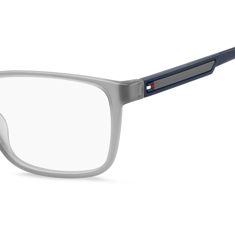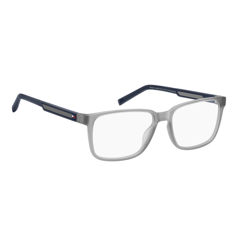 Informal but impeccable style defines these TOMMY HILFIGER eyeglasses. Their sporty aesthetic is defined by temples in a sustainable material with a rubber insert featuring the Polo Pique texture and the brand's iconic flag. The design is a best-seller, featuring injection-moulded bio-based and bio rubber materials. and completed by flexible hinges.