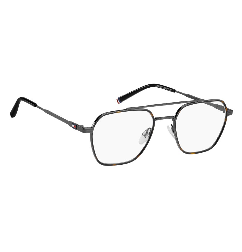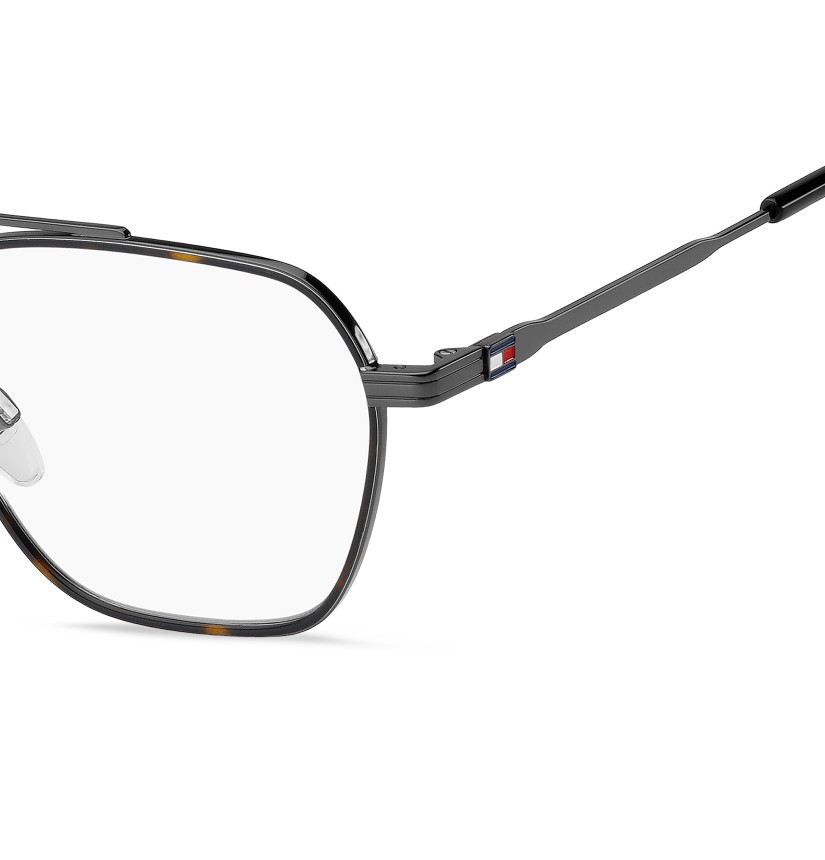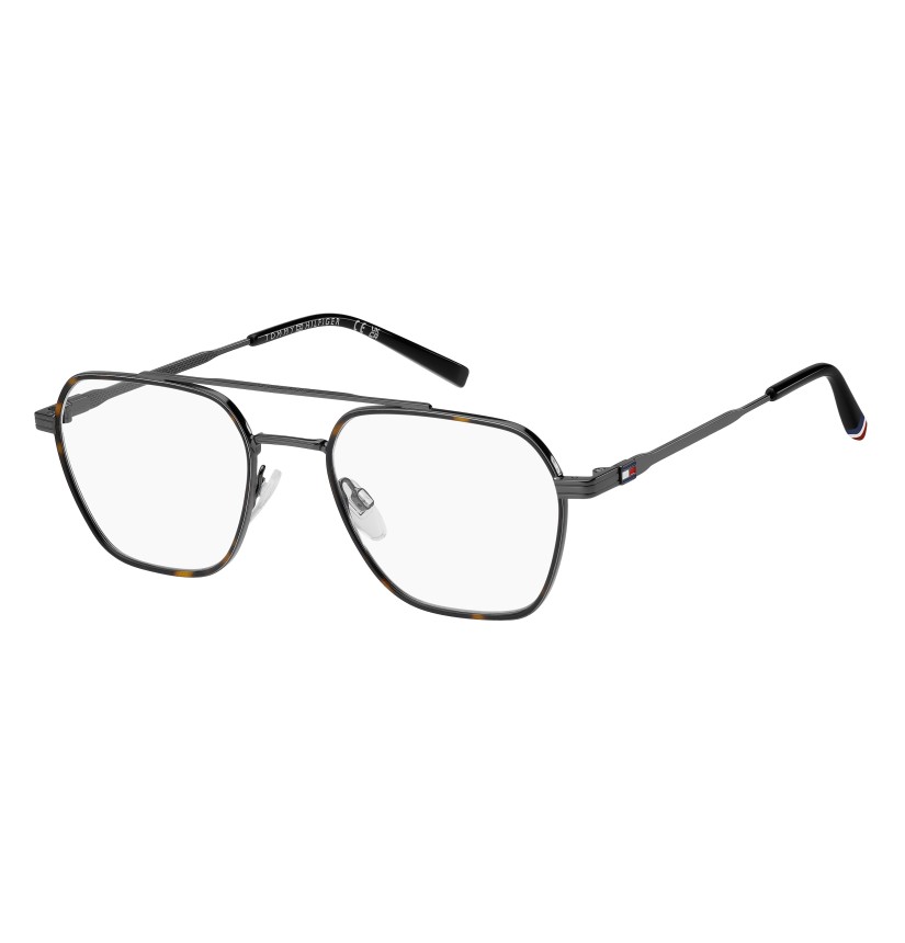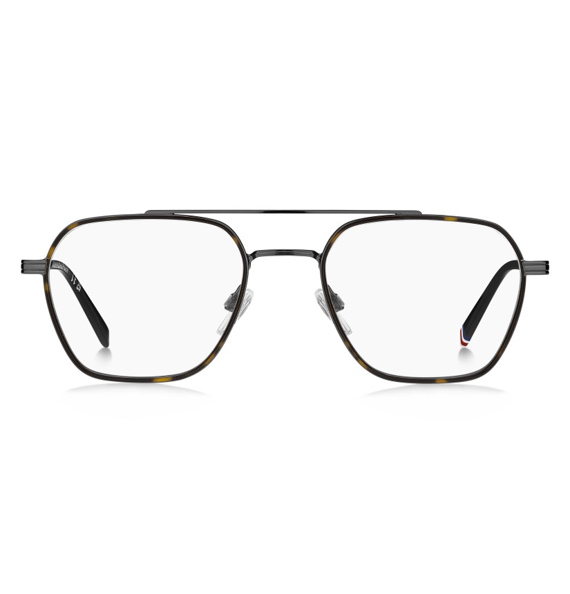 These preppy TOMMY HILFIGER eyeglasses are inspired by American collegiate style. Their casual-chic aesthetic has been updated by on-trend details, such as the double bridge at the front. The brand's flag decorates the temples, echoed by the ribbon on the left end tip. Shapes and materials come together to offer lightness, while the nose pads ensure greater stability.