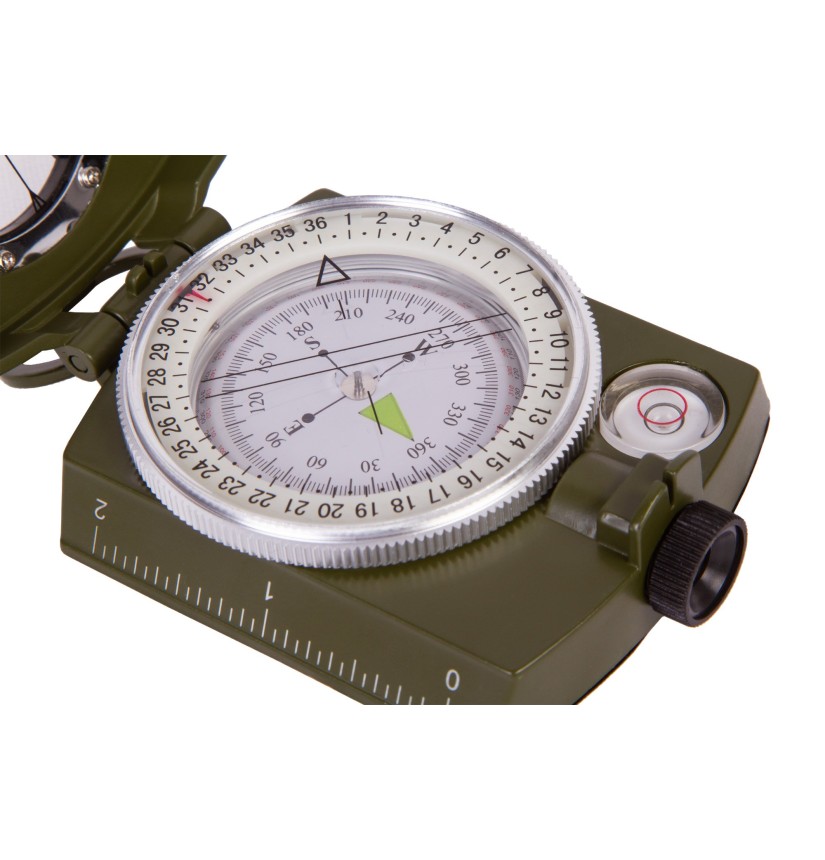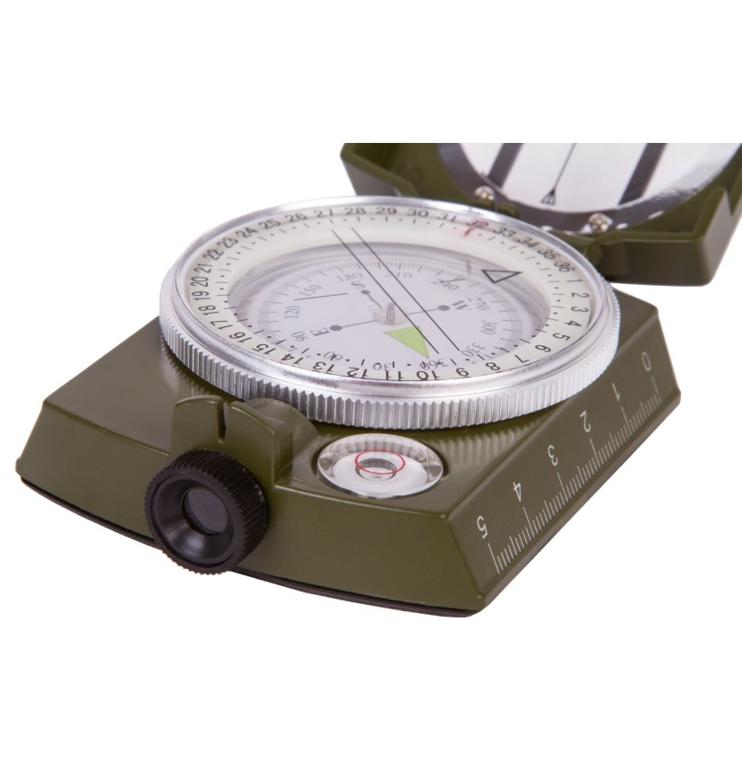 La bussola è dotata di design pieghevole, inoltre, sul coperchio è presente una finestra trasparente. Grazie a essa è possibile leggere la bussola anche quando il coperchio è chiuso. Il quadrante graduato è immerso in un liquido speciale, affinché l’ago magnetico si stabilizzi velocemente e mostri la direzione. Con questa bussola è possibile rilevare la posizione in gradi. La bussola è dotata di livella a bolla integrata, per semplificare l’allineamento della bussola sull’asse orizzontale.