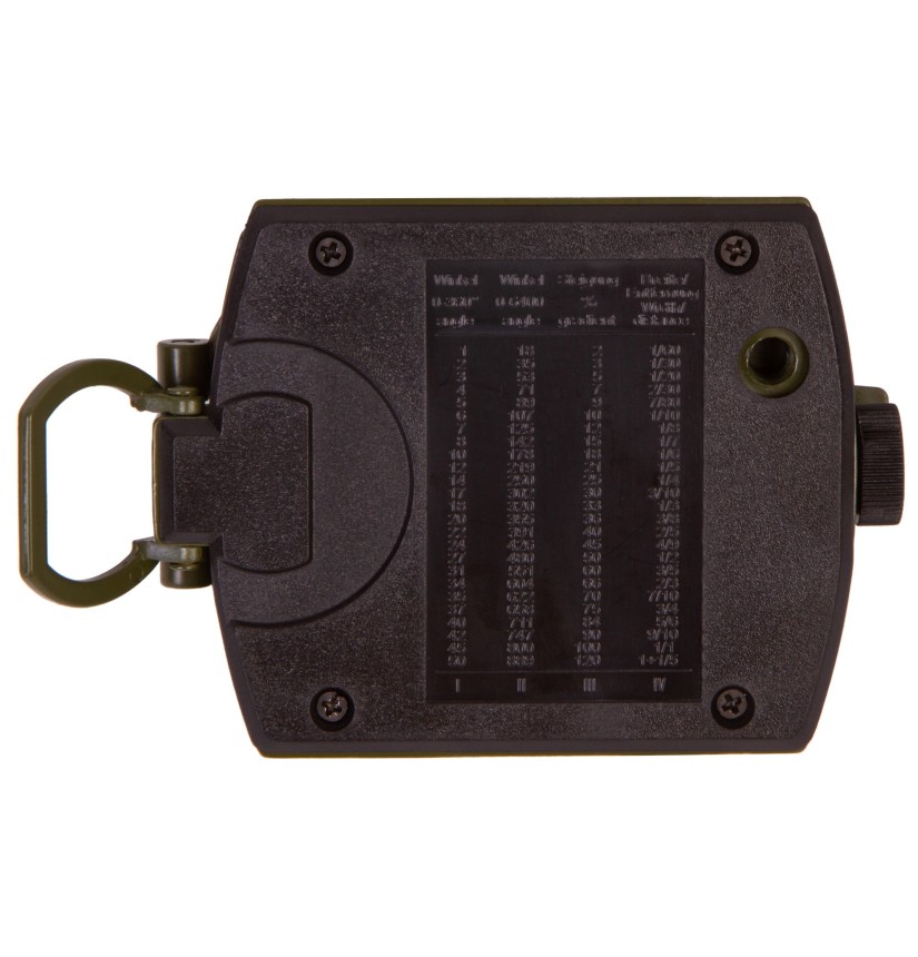 Un’opportuna fessura di puntamento consente di mirare a oggetti distanti e rilevarne la posizione. È possibile leggere precisamente il numero sul quadrante attraverso una speciale lente posizionata sul corpo della bussola. Lungo la fessura di puntamento è presente una scala in mils per la misura della distanza tra gli oggetti. Due sono le scale utilizzabili per la lettura delle mappe: una scala in centimetri e una in pollici. Sul retro della bussola è presente una tabella di conversione.