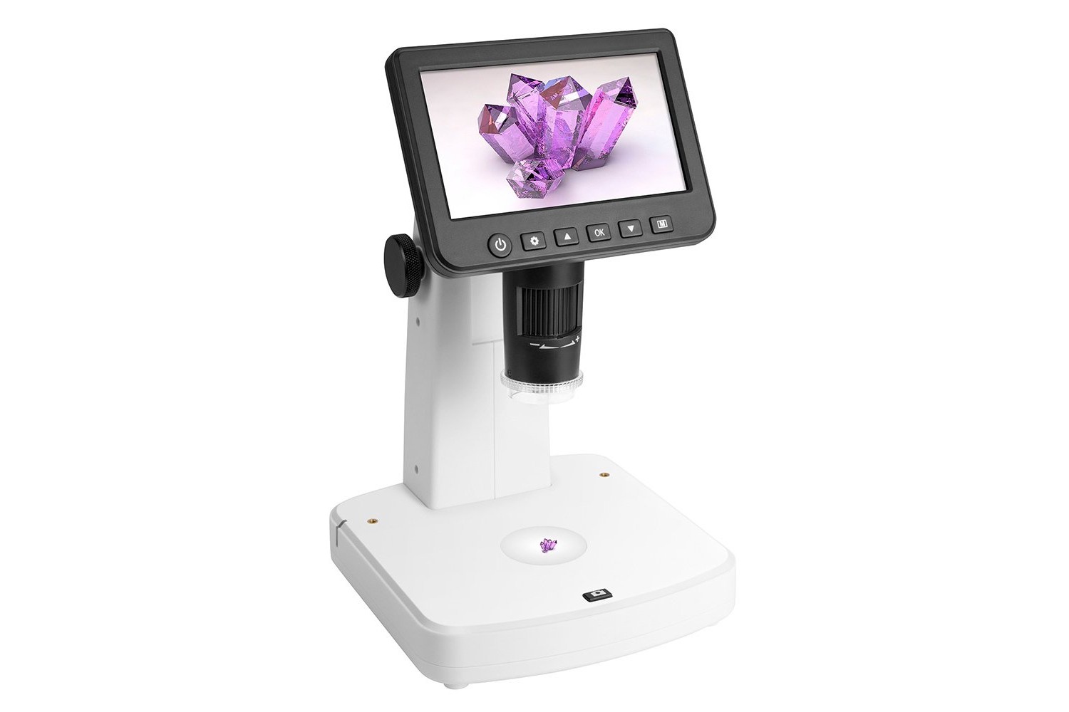 L’immagine è riprodotta da una fotocamera digitale da 5 MP. La fotocamera fornisce un ingrandimento da 10 a 300x e un ulteriore zoom digitale consente l’osservazione di oggetti fino a 1200x. L’immagine, vivida e dettagliata, è quindi trasmessa allo schermo LCD integrato. Inoltre, la fotocamera incorporata consente di catturare immagini e girare video. I pulsanti di controllo sono posizionati al di sotto dello schermo. Servono per selezionare la qualità di foto e video, attivare e disattivare la modalità time-lapse, scegliere la modalità video circolare e impostare la data e l’ora.