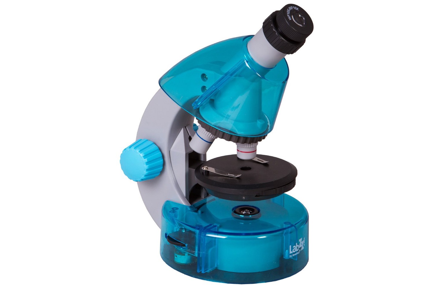 Questo microscopio consente di osservare campioni trasparenti – una goccia d’acqua di acquario, vetrini sottili di piante o vetrini preparati da microscopio. Gli oggetti devono essere posizionati sul comodo tavolino rotondo e fissati con due levette. Grazie a queste levette, i campioni studiati saranno sempre al loro posto. La luce emessa dai diodi a LED (posizionati sotto il tavolino) passa attraverso i campioni, creando l’immagine ingrandita nell’oculare. È possibile regolare il livello di luminosità.