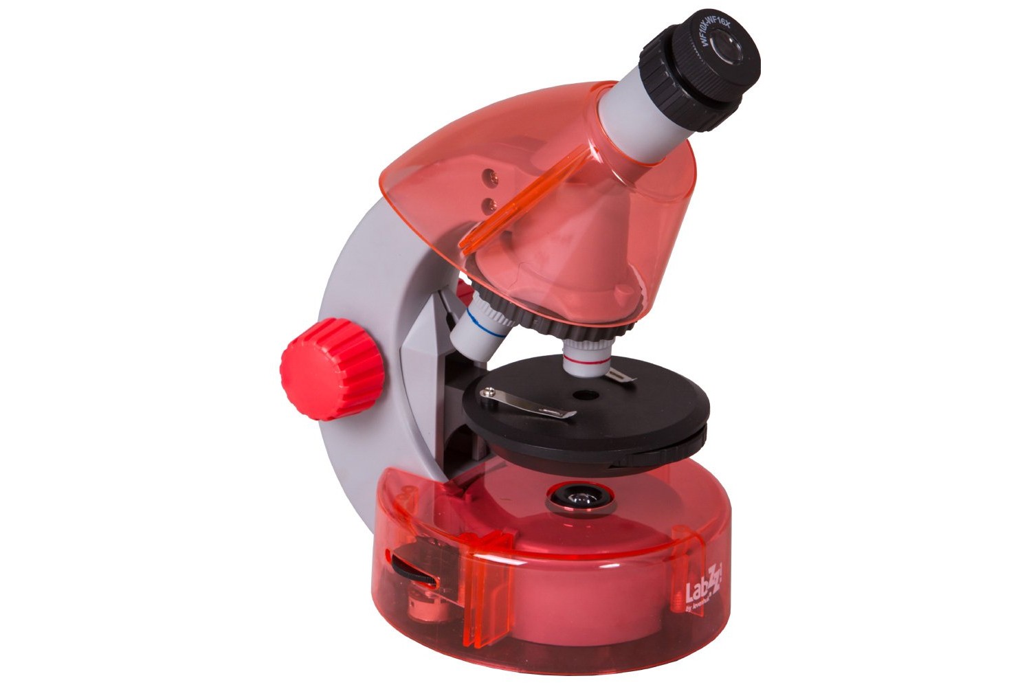 Questo microscopio consente di osservare campioni trasparenti – una goccia d’acqua di acquario, vetrini sottili di piante o vetrini preparati da microscopio. Gli oggetti devono essere posizionati sul comodo tavolino rotondo e fissati con due levette. Grazie a queste levette, i campioni studiati saranno sempre al loro posto. La luce emessa dai diodi a LED (posizionati sotto il tavolino) passa attraverso i campioni, creando l’immagine ingrandita nell’oculare. È possibile regolare il livello di luminosità.