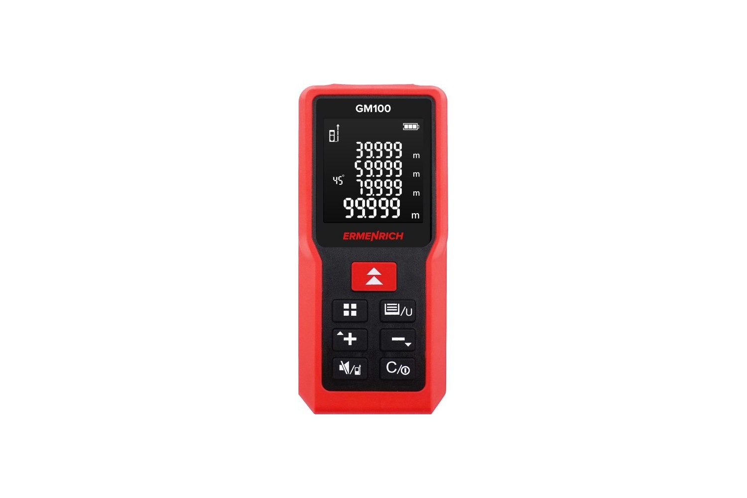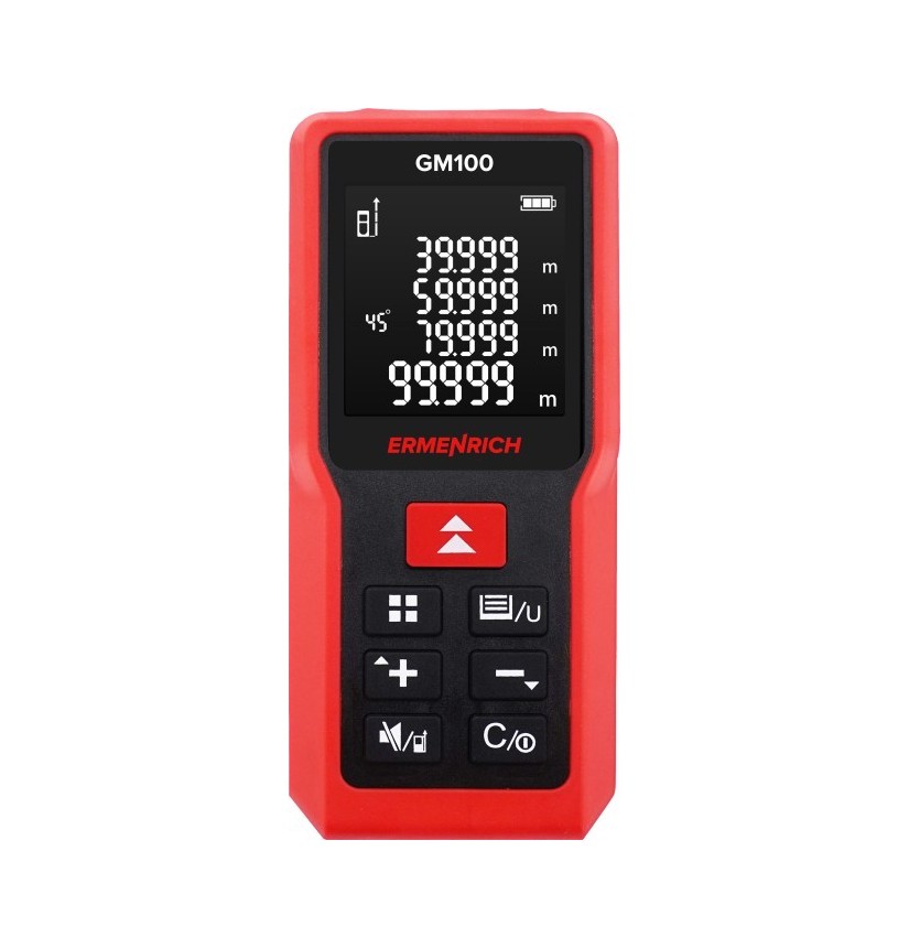 L’Ermenrich Reel GM100 è un misuratore laser progettato per effettuare misure nei cantieri edilizi e durante i lavori di ristrutturazione. Può essere usato anche per le misure dei confini catastali e per le misure dei terreni, nonché per qualsiasi altra applicazione che necessiti di misure precise delle dimensioni lineari di un oggetto, della sua area o del suo volume. La massima distanza misurabile è pari a 100 metri. Il misuratore laser può effettuare anche misurazioni angolari. Grazie alla funzione teorema di Pitagora, lo strumento calcola automaticamente le distanze basandosi su delle misure intermedie. Questa funzione è particolarmente utile quando non è possibile posizionare il laser in modo da puntare il raggio laser lungo la direzione che si desidera misurare.