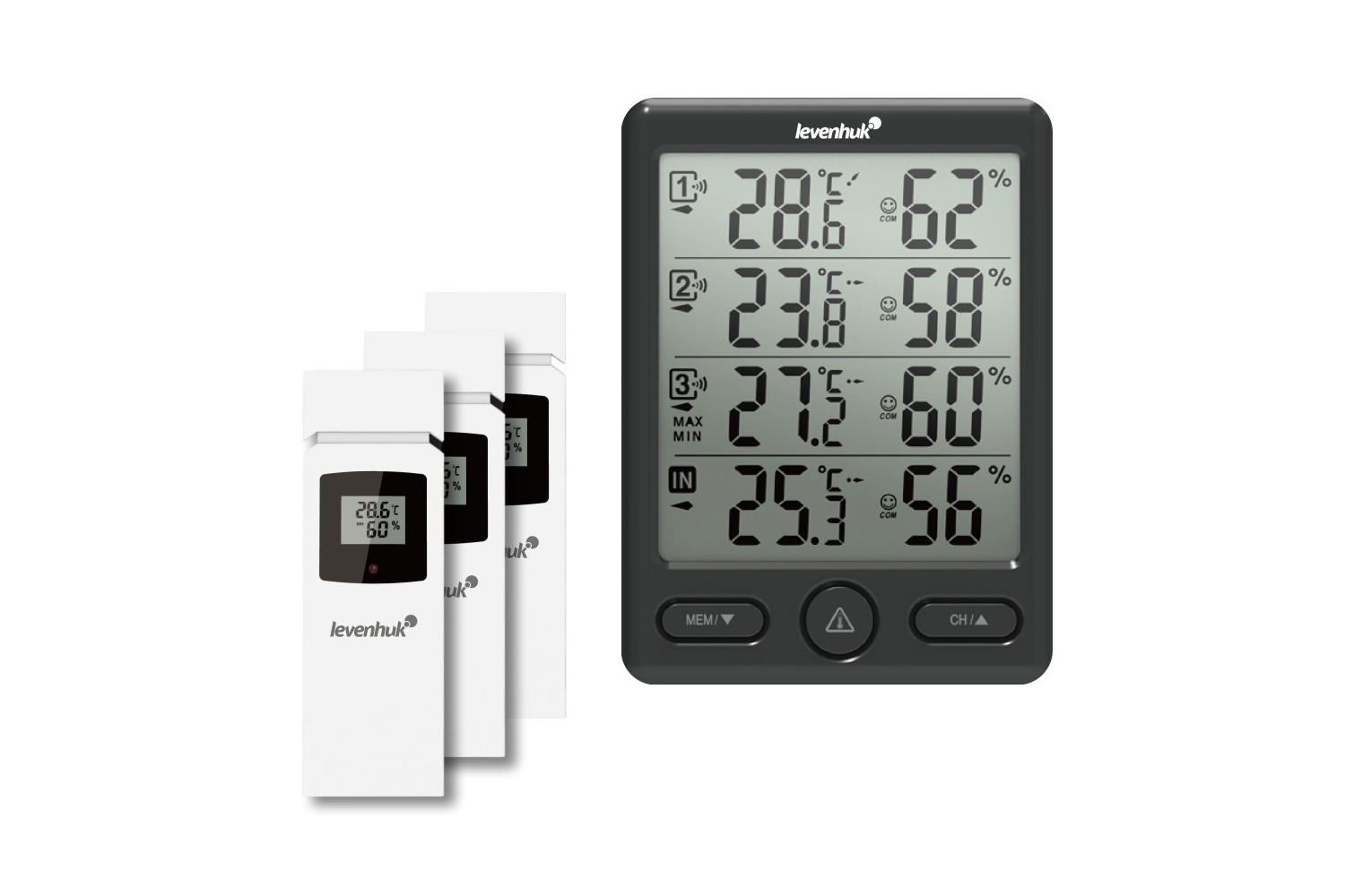 La stazione meteorologica Levenhuk Wezzer PLUS LP20 misura la temperatura e l’umidità in quattro postazioni simultaneamente. Si tratta di uno strumento comodissimo per monitorare le variazioni meteo e il microclima di varie stanze all’interno di un edificio o, ad esempio, nel terreno circostante. L’unità base della stazione meteorologica misura la temperatura e l’umidità nella postazione di installazione e può essere appesa a una parete o posizionata su una superficie piana. I tre sensori remoti wireless trasmettono i dati alla base tramite collegamento radio. Possono essere appesi a delle pareti distanti fino a 100 metri dalla base.