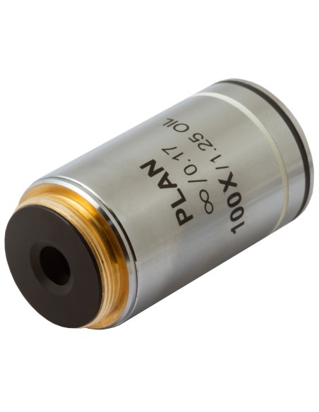 Le lenti dell’obiettivo sono realizzate in vetro e la lente frontale è protetta da un telaio con meccanismo a molla. Il corpo dell’obiettivo è realizzato in metallo. L’obiettivo planacromatico all’infinito Levenhuk MED 100x è perfetto per l’impiego professionale in microbiologia.