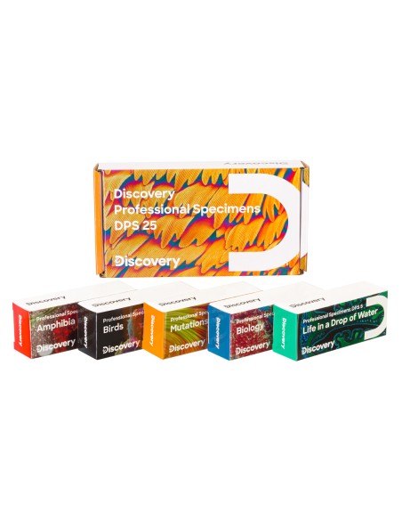 Il set di micropreparati Discovery Prof DPS 25. “Biologia, uccelli, ecc.” è un ampio set di 25 vetrini preparati per l’analisi al microscopio. Comprende i vetrini dei cinque kit tematici Discovery Prof DPS 5, cioè “Biologia”, “Mutazioni”, “La vita in una goccia d’acqua”, “Mondo anfibio” e “Uccelli”. Questo set offre una stupenda esperienza educativa in varie discipline biologiche e dà accesso a informazioni approfondire sulla struttura degli organismi viventi. Sono inclusi vari campioni di tessuto vegetale e animale, sia sani che danneggiati da fattori esterni.