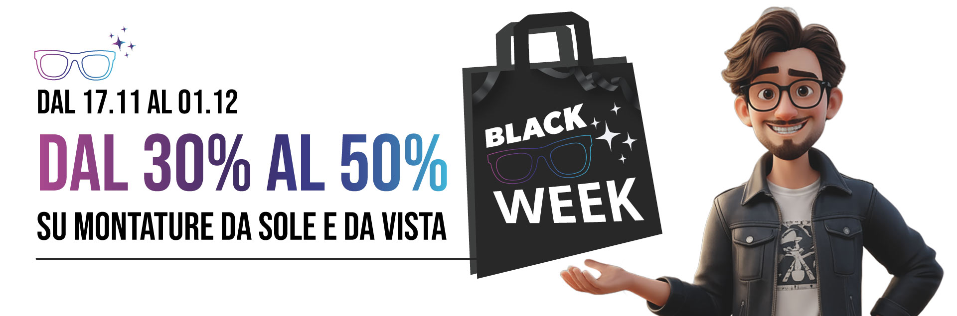 Le offerte del Black Friday non sono cumulabili con altre promozioni in corso e si riferiscono a montature da sole e da vista selezionate, che trovate identificate opportunamente sia nei Centri Ottici che online.