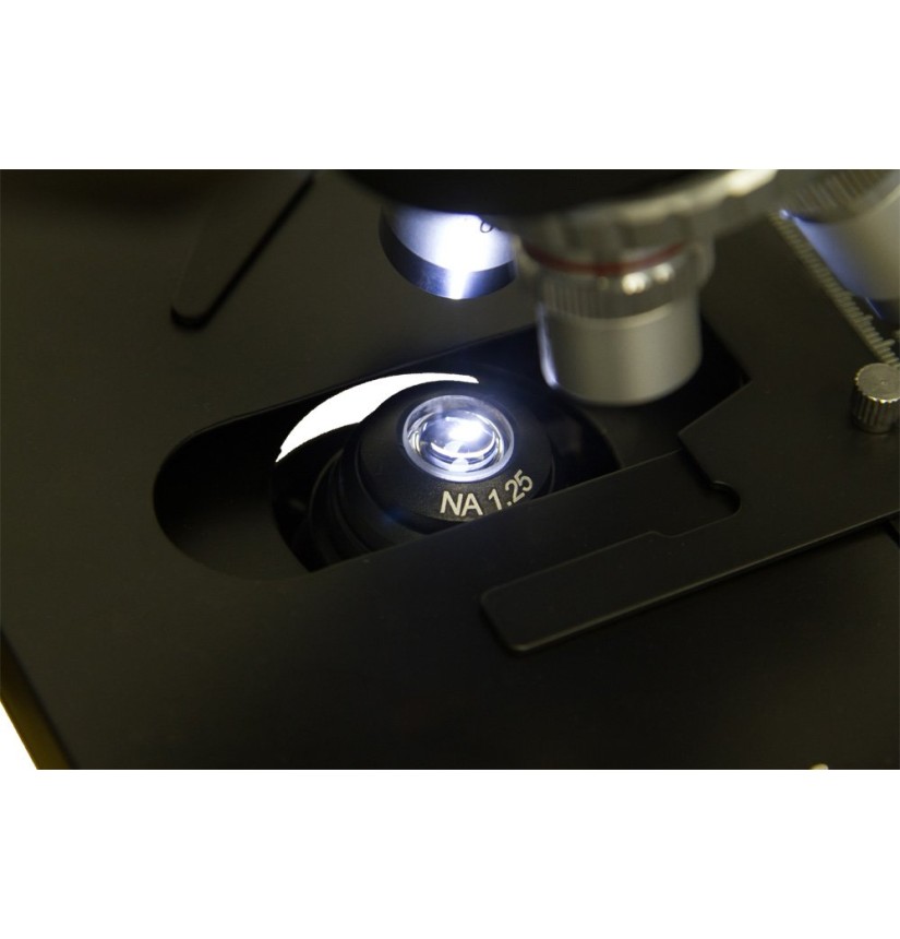 Il microscopio è dotato di illuminazione dal basso, il che significa che è possibile osservare solo campioni trasparenti. L’intensità della luce è regolabile entro un’ampia gamma. Un condensatore di Abbe amplifica ripetutamente il raggio luminoso e lo dirige esattamente sull’area di interesse. Questo microscopio consente osservazioni in modalità a campo chiaro. È possibile anche l’impiego di immersione in olio.