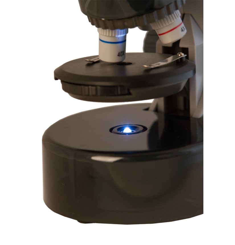 Questo microscopio consente di osservare campioni trasparenti – una goccia d’acqua di acquario, vetrini sottili di piante o vetrini preparati da microscopio. Gli oggetti devono essere posizionati sul comodo tavolino rotondo e fissati con due levette. Grazie a queste levette, i campioni studiati saranno sempre al loro posto. La luce emessa dai diodi a LED (posizionati sotto il tavolino) passa attraverso i campioni, creando l’immagine ingrandita nell’oculare. È possibile regolare il livello di luminosità.