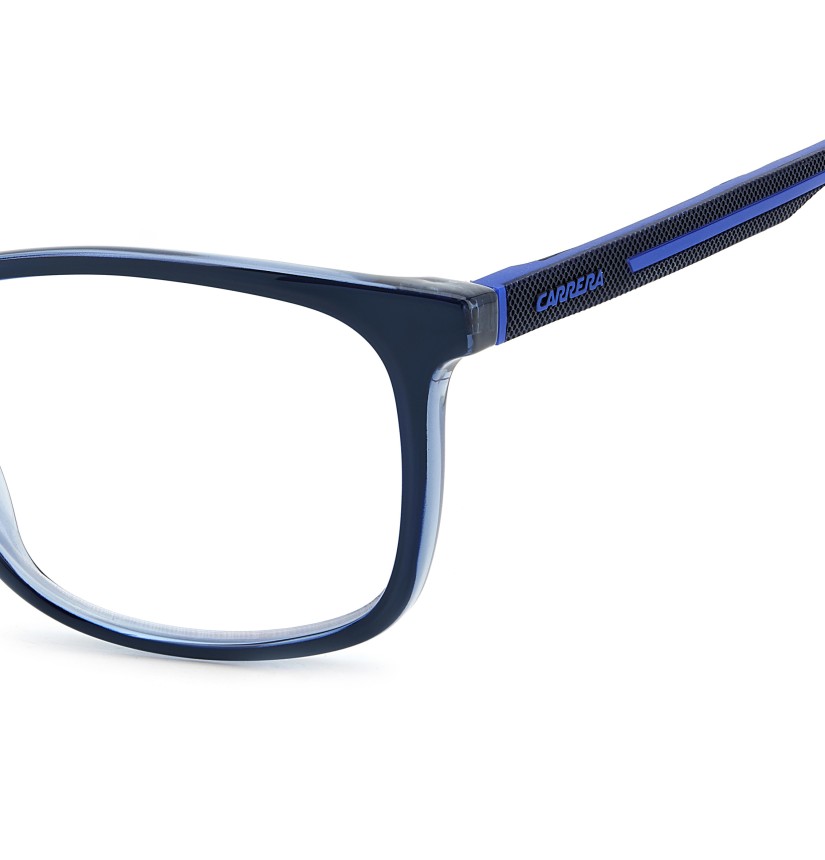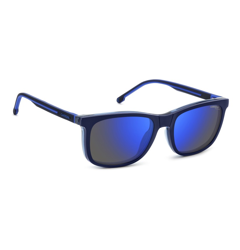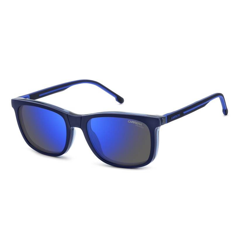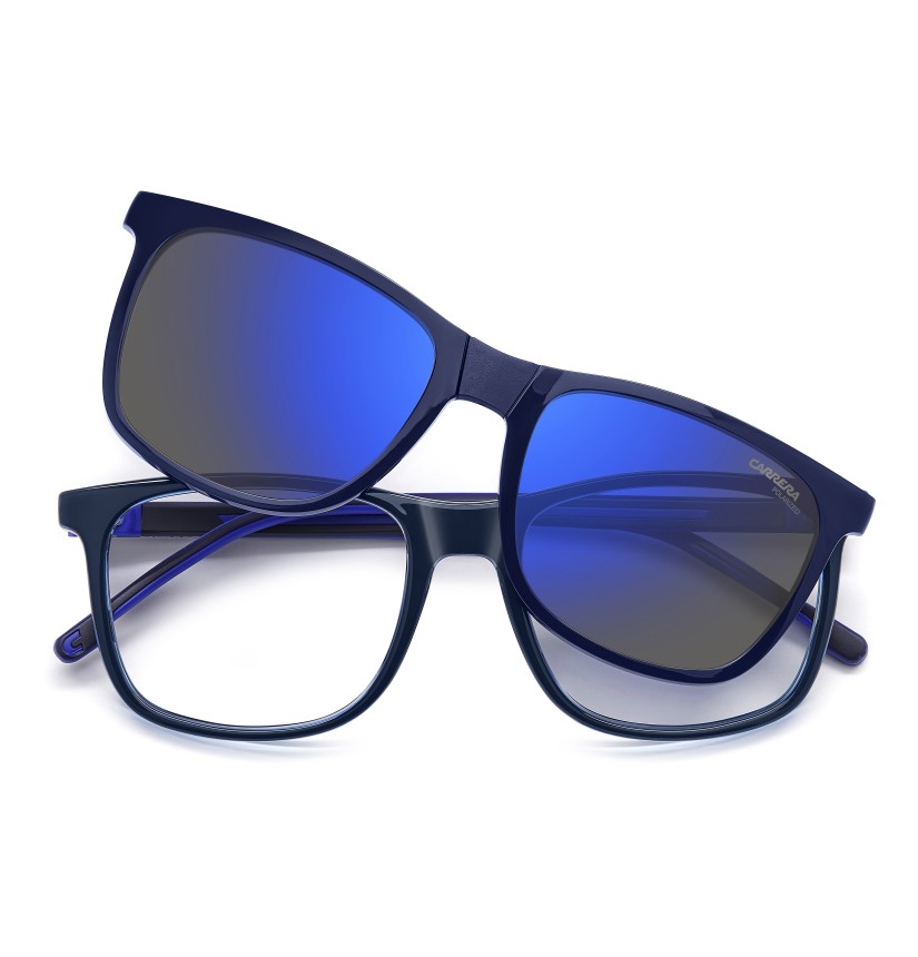 These Carrera eyeglasses combine performance and style. The rectangular front is impeccable, available plain colours or a two-tone version. It can be transformed in an instant by overlapping the polarized clip-on sun lenses, included with each pair of glasses. The temples are textured, with contrast rubber inserts and an embossed logo, in-line with the dynamic character of this style.