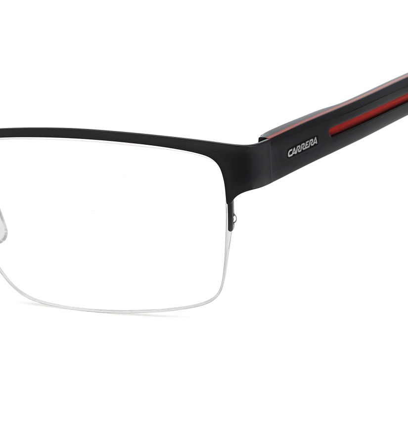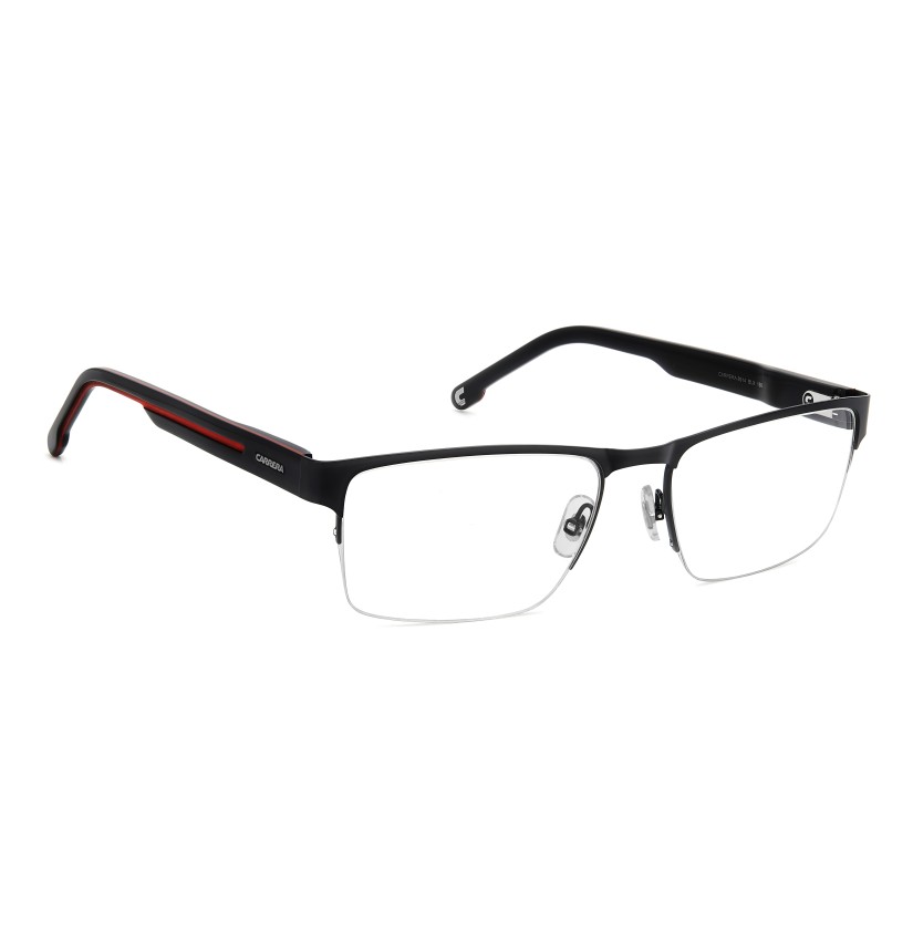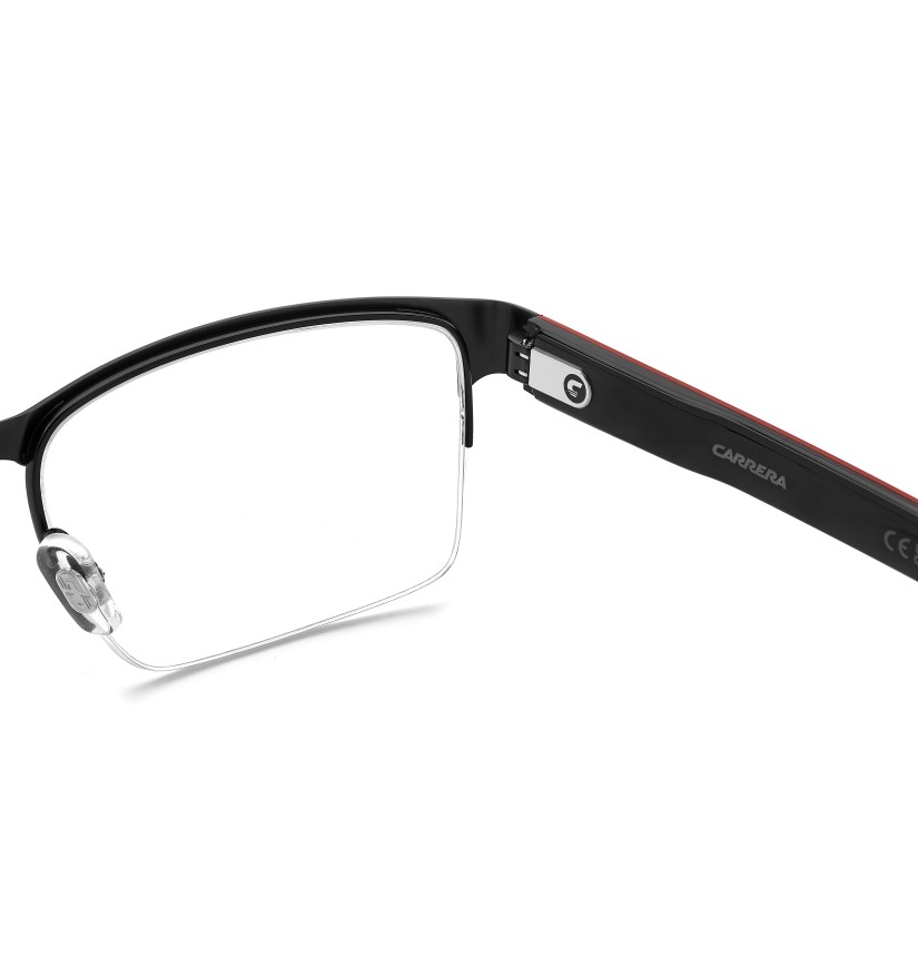 Carrera takes comfort and versatility very seriously: the result is this pair of eyeglasses with half-rim frames. Adjustable nose pads, flexible hinges and the option to choose between two lens sizes ensure a personalised fit. Newly designed acetate temples, which have been sculpted to reference the Carrera flag, define this style. The accents are either tone-on-tone, blue or in the quintessential Carrera hue: red.