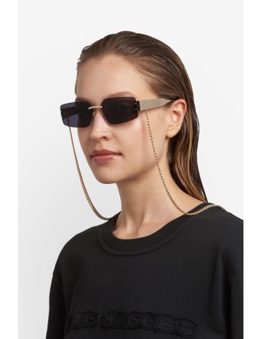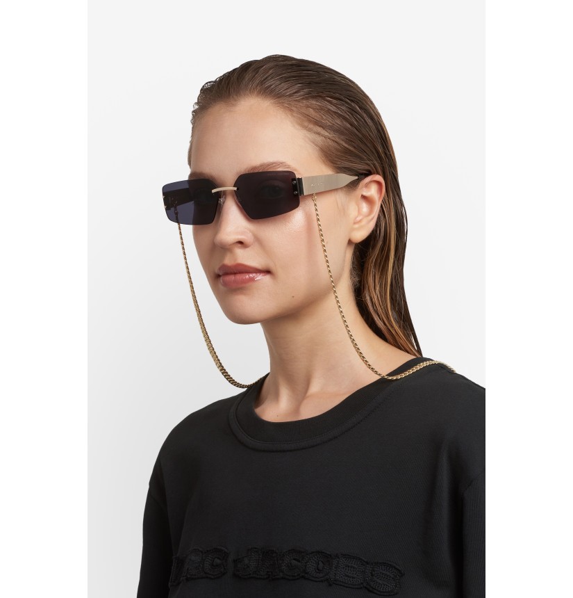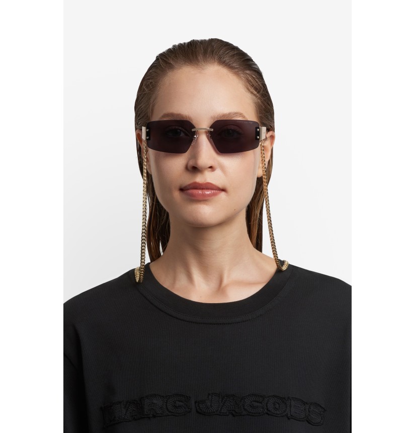 Evolving the Marc Jacobs eyewear bold metal concept, the new collection of women's sunglasses is a sleek take on modern glamour. Made in a cool, rimless design, they have a statement metal construction featuring wide temples and long acetate tips to sit comfortably behind the ear. Enhanced by a signature laser-etched logo on one lens and a practical chain in matching metallic finish.
