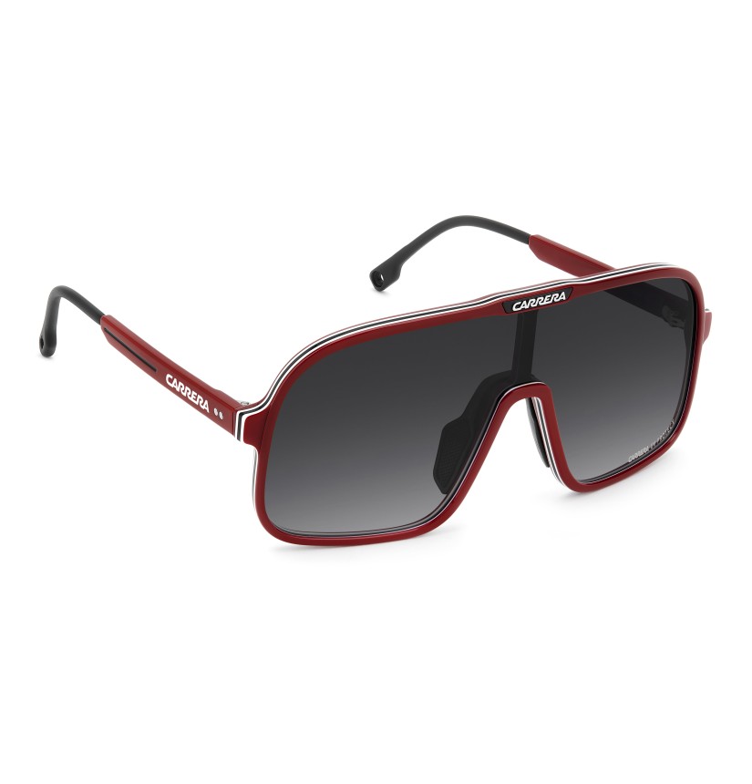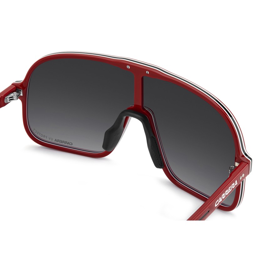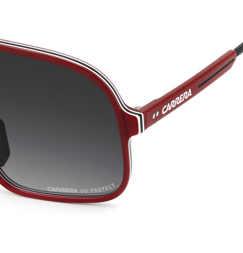 These sunglasses bring a fresh twist to Carrera's archival designs. The maxi-lens navigator front in acetate showcases sporty heritage, made even more iconic with multi-layer detailing. Rubber nose pads and adjustable curved end tips ensure a secure fit. The color palette includes a version with blue gradient lenses that's distinctively Carrera.