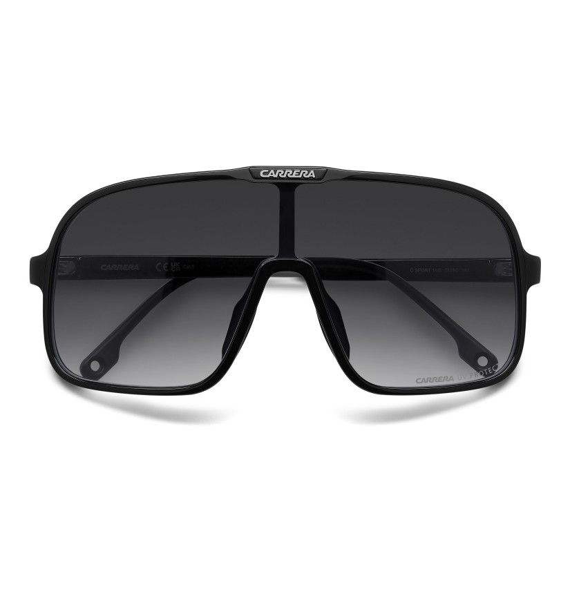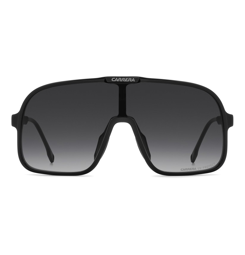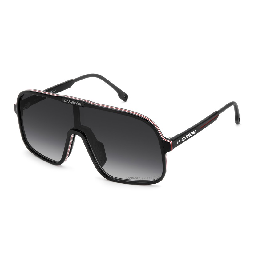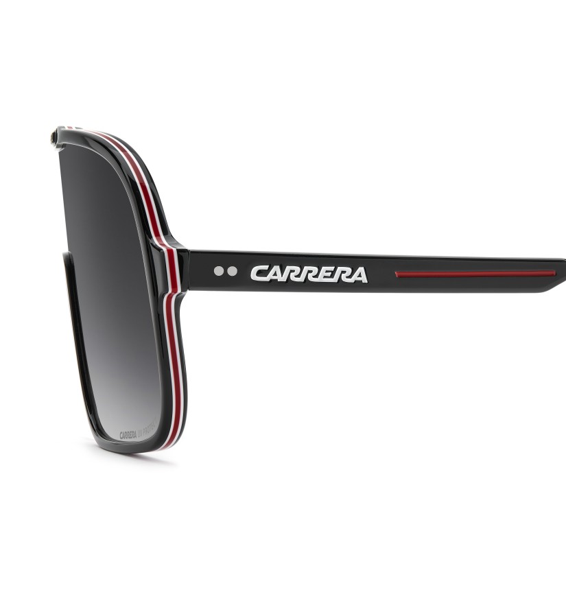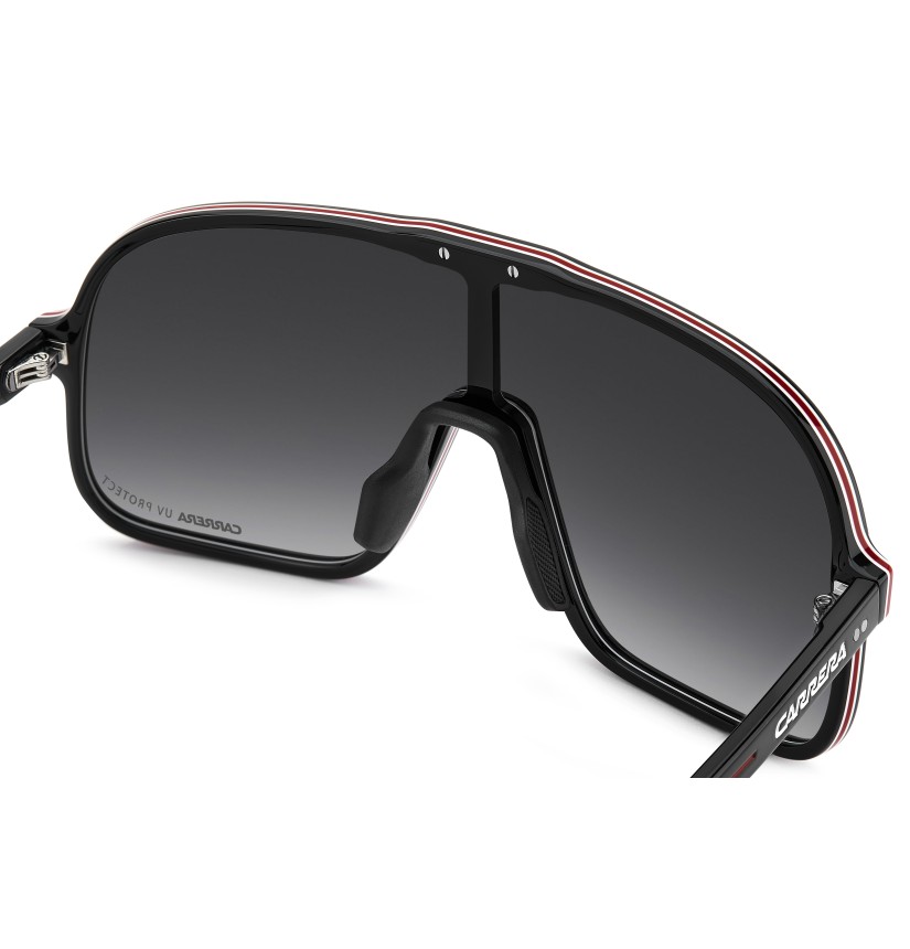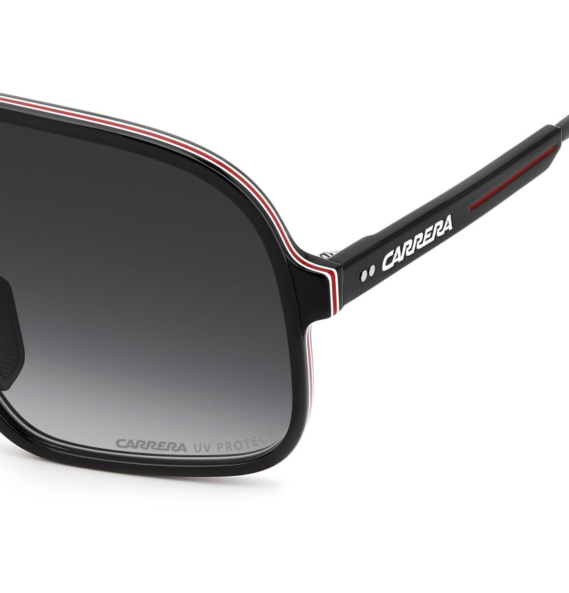 These sunglasses bring a fresh twist to Carrera's archival designs. The maxi-lens navigator front in acetate showcases sporty heritage, made even more iconic with multi-layer detailing. Rubber nose pads and adjustable curved end tips ensure a secure fit. The color palette includes a version with blue gradient lenses that's distinctively Carrera.