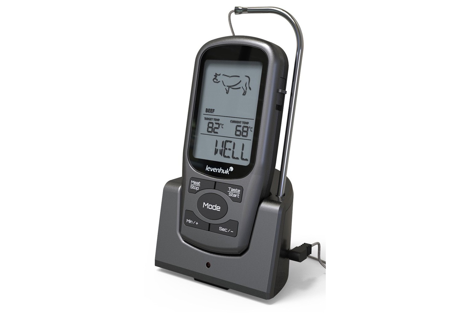 Levenhuk F30 è un termometro a sonda wireless progettato specificatamente per la massima precisione nella misura della temperatura di cottura delle carni. La sua funzionalità più interessante è l’opzione di scelta del tipo di carne e del grado di cottura desiderato. Ciò rende possibile ottenere un piatto cucinato alla perfezione con il minimo sforzo. Questo strumento è anche dotato di timer e di una funzione di notifica tramite cicalino per quando si raggiunge la temperatura limite.